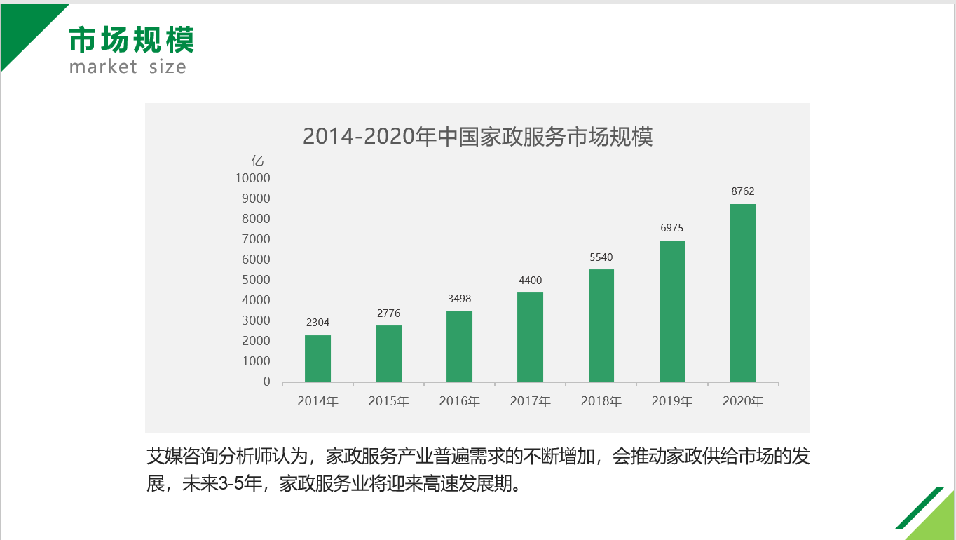 2021年1月和3月,大班家政先后在深圳福田、北京海淀開設(shè)新店,上海、廣州直營(yíng)門店也在積極籌劃后即將落地。“大班家政作為京城家政名片,持續(xù)15年提供全品類高端家政服務(wù),我們十分看好國(guó)家政策性引導(dǎo)和互聯(lián)網(wǎng)+帶來的發(fā)展空間,據(jù)統(tǒng)計(jì)國(guó)內(nèi)有著8000億+的家政市場(chǎng)規(guī)模,我們希望在家政服務(wù)領(lǐng)域逐步建立起一個(gè)高端品牌,在保證入戶服務(wù)品質(zhì)的基礎(chǔ)上,穩(wěn)步實(shí)現(xiàn)規(guī)?;⑦B鎖化發(fā)展。”創(chuàng)始人張瑜女士表示。